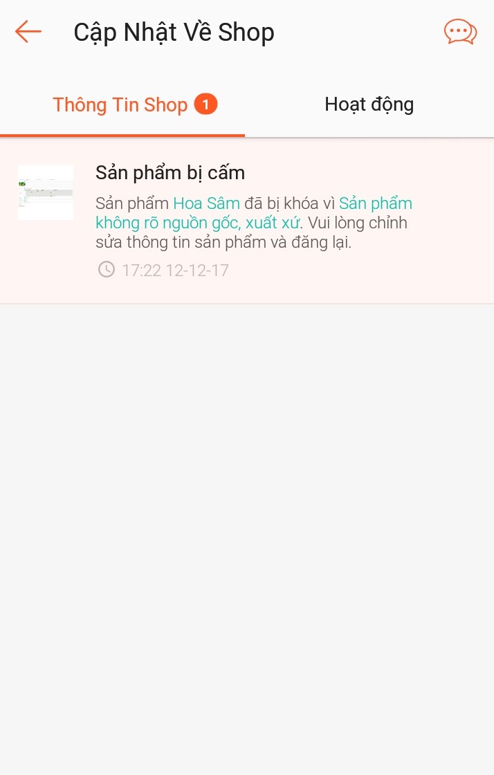 ​​​​​​​⚠️ Lưu ý: Nếu sản phẩm của Người bán bị khóa với lý do không rõ nguồn gốc, xuất xứ và bạn chưa cung cấp đủ giấy tờ chứng thực, Người bán sẽ nhận được thông báo như sau: