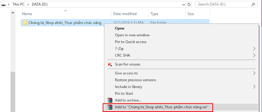 Bước 2: Nhấn chuột phải vào thư mục đã tạo và nén tập tin/file thành định dạng zip/rar như hướng dẫn sau: