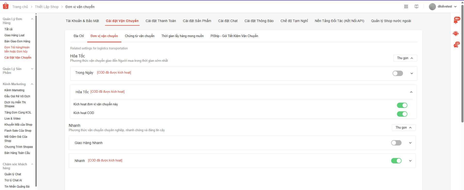 - Lựa chọn bật/tắt các phương thức vận chuyển: Hỏa Tốc, Nhanh, Hàng Cồng Kềnh, Tủ nhận hàng cho Shop và cho từng sản phẩm;